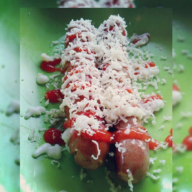 - Tempatkan sosis di dalam piranti saji, siram dengan saus mayones lalu taburi dengan keju parut.