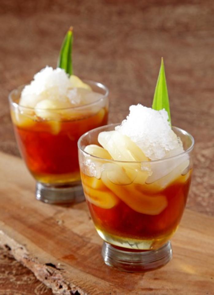 - Masukkan potongan siwalan dalam gelas, kemudian tuang air legen dan es serut.