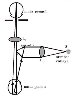 dari optalmoskup. berkas cahaya yang datang dari sumber cahaya S yang