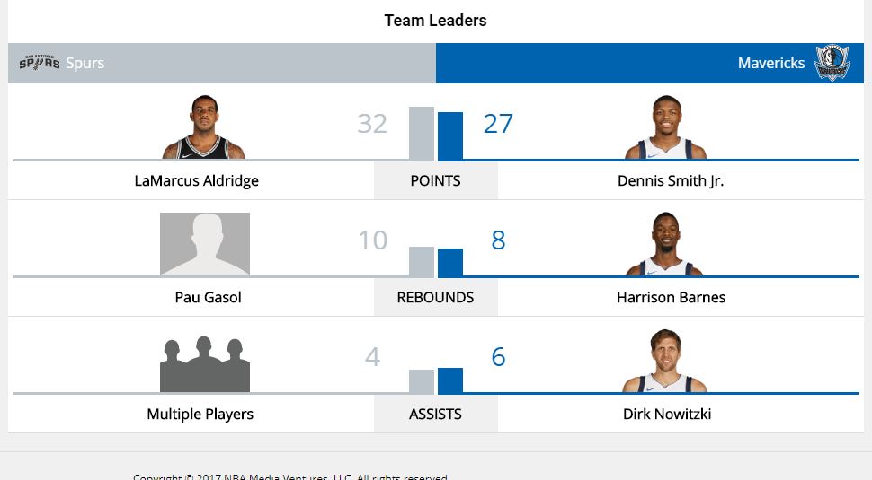 Sementara di pihak Dallas, pencetak poin terbanyak di raih oleh Rookie Dennis Smith JR. dengan 27 poin, 6 rebounds, dan 2 assist.
